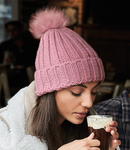 100% soft spun acrylic. Heavy ribbed knit. Cuffed design. Removable self colour faux fur pom pom. Tear out label.