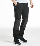 93% polyester/7% elastane. Kingsmill polyester stretch fabric. Slim fit. Ribbed waistband with self colour drawcord. D-ring. Two side and one rear zip pockets with branded zip pulls. Two tear release cargo pockets. Crotch gusset for ease of movement. Double layer reinforced pre-bent knees. Cuffed leg ends. Branded tab on right cargo pocket.